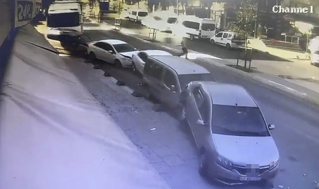 İstanbul'un Sultanbeyli ilçesinde tır ile taksinin karıştığı hasarlı kazada tutanak tutulduğu sırada tır, yokuş aşağı kaymaya başladı. Kontrolden çıkan tır, park halindeki araçlara çarptı. 5 aracın birbirine girdiği kaza anı güvenlik kamerasına yansıdı.