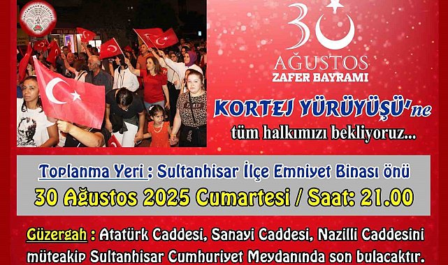 Aydın genelinde olduğu gibi Sultanhisar ilçesinde de 30 Ağustos Zafer Bayramı için kutlama hazırlıkları sürüyor. Bu çerçevede Sultanhisar Belediyesi öncülüğünde kortej yürüyüşü gerçekleştirilecek. 30 Ağustos zaferinin 103. yılı kutlamalar kapsamında düzenlenecek olan kortej, Sultanhisar İlçe Emniyet binası önünden başlayacak. Atatürk Caddesi, Sanayi Caddesi ve Nazilli Caddesi güzergahından Cumhuriyet Meydanı'nda son bulacak olan kortej, saat 20.00'de başlayacak. Herkesi korteje davet eden Sultanhisar Belediye Başkanı Osman Yıldırımkaya, "30 Ağustos Zaferi için tüm halkımızı kortejimize bekliyoruz" dedi.
