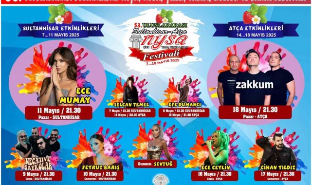 1940'lı yıllarda 'Portakal Festivali' olarak düzenlenen ve son yıllarda uluslararası düzeyde kutlanan Sultanhisar Atça Nysa Çilek Tarım Kültür ve Sanat Festivali 53. kez coşkuya sahne olacak. Nysa Zerafet Güzeli ve Çilek Güzeli yarışmaları ile binlerce genç kızın heyecanla beklediği festival, 7-18 Mayıs tarihlerinde Sultanhisar ve Atça'da gerçekleştirilecek. 9 gün sürecek olan festival kapsamında gerçekleştirilecek olan yarışmaların yanı sıra birbirinden ünlü isimler de sahne alarak sevilen şarkılarıyla misafirlere festival coşkusunu yaşatacak.
