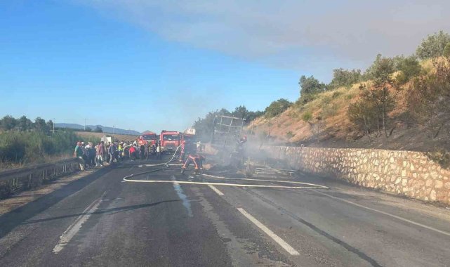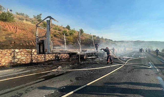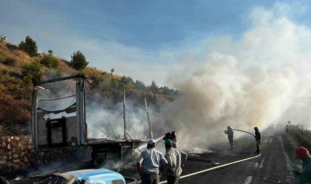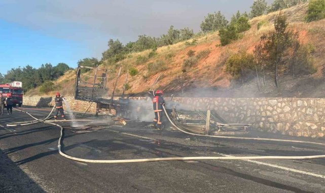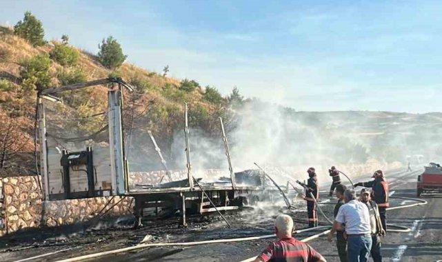 Bilecik'in Osmaneli ilçesinde sunta yüklü tırın dorsesi alev alev yandı.