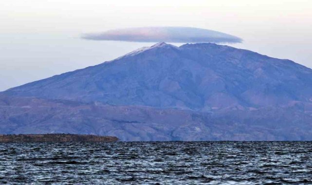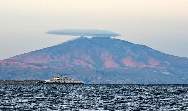 Bitlis'in görkemli simgelerinden biri olan ve 4 bin 58 rakımı ile Türkiye'nin üçüncü yüksek dağı olan Süphan Dağı, doğa tutkunlarını büyüleyen eşsiz bir manzaraya sahne oldu. Akşam saatlerinde dağın zirvesini saran mercek bulutu, Tatvan sahilinden fotoğraflandı. Van Gölü'nün masmavi suları ve üzerinde seyreden feribotla birlikte Süphan Dağı'nın manzarası hayranlık uyandırdı.