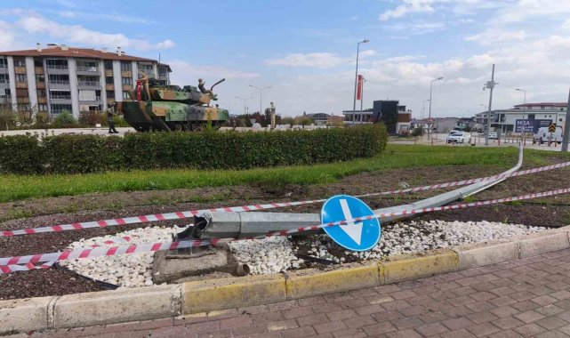 Süratle kavşağa giren otomobil heykelleri biçerek metrelerce havaya uçtu