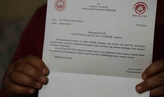 Öte yandan, ailenin evine de Çocuk Evleri Sitesi Müdürlüğü'nden gönderilen evrakta, "Kuruluşumuzda korunma ve bakım altında kalan kızınız Eda, 26.09.2025 tarihinde bakım hizmetini reddederek kuruluştan izinsiz ayrılmış olup durumu Şakirpaşa Polis Merkezi Amirliğine bildirilmiştir. Kızınız Eda'nın adresinize intikal etmesi veya kendisinden haber almanız halinde kolluk kuvvetlerine ve kuruluşumuz Adana Çocuk Evleri Sitesi Müdürlüğüne bilgi veriniz" denildi.