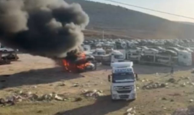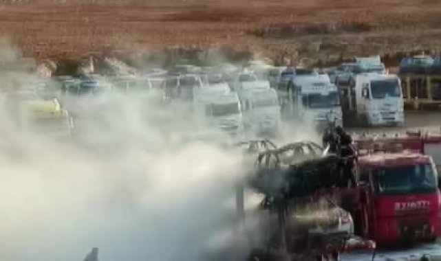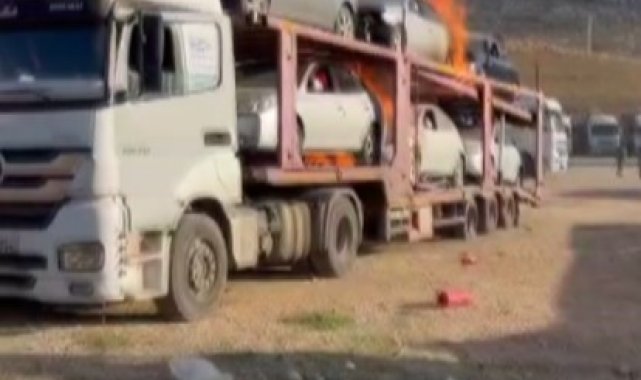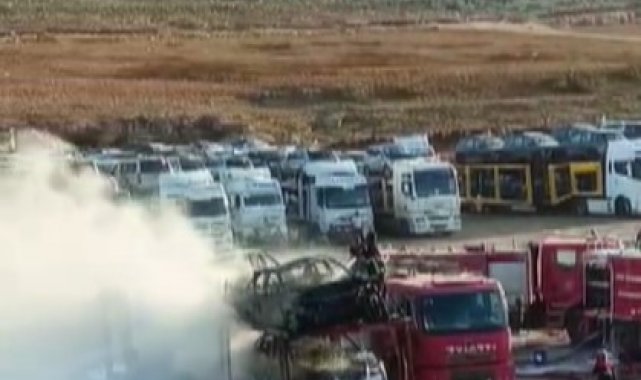 Hatay'da bulunan Cilvegözü Sınır Kapısı'ndan Suriye'ye geçmeyi bekleyen tırda yüklü araçlar alevlere teslim oldu. Yangında 6 araç yanarak kullanılamaz hale geldi.