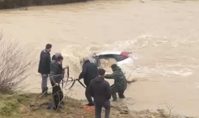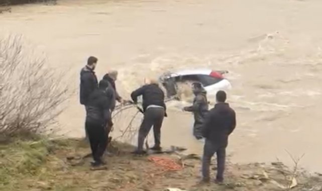 Sürücü kıyıya çıktı, otomobil suda kaldı: Vatandaşlar halatla müdahale etti