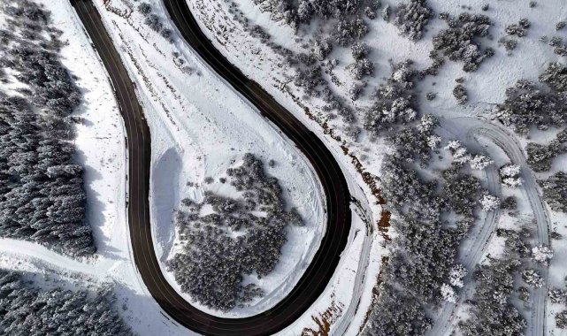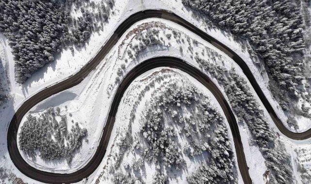 Gümüşhane-Şiran arasındaki en kısa güzergah olan 2 bin rakımlı Tersun Dağı Geçidi, etkili olan kar yağışının ardından kartpostallık görüntülere sahne oldu. Kıvrım kıvrım yolları ve dik rampalarıyla sürücülerin 'korkulu rüyası' olan geçitte, karın oluşturduğu eşsiz manzara havadan görüntülendi.