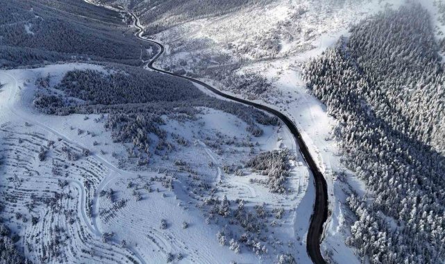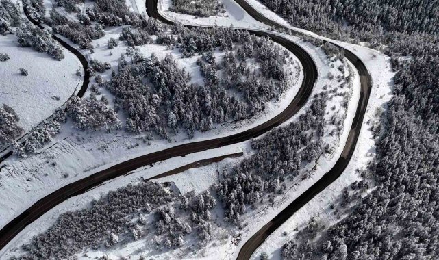 Drone çekimlerine yansıyan görüntülerde, kar altındaki kıvrımlı yolların arasından süzülen araçlar, doğanın gücü karşısındaki mücadeleyi gözler önüne seriyor. Bölgedeki ormanlık alanlar, devasa ağaçların dallarındaki kar kütleleriyle kışın tüm görkemini yansıtıyor.