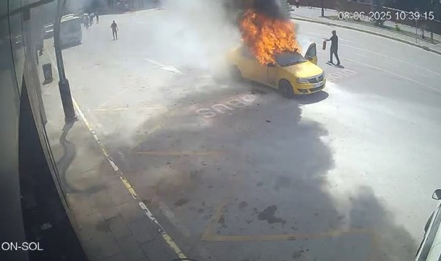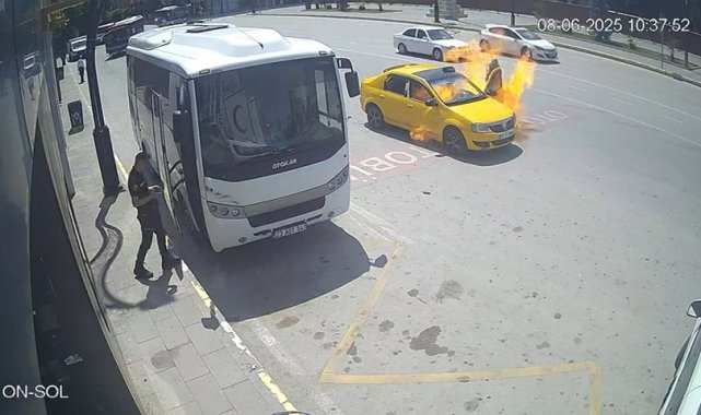 Elazığ'da yolcu bekleyen bir ticari taksi sürücüsü, araçta çakmağı çakması ile otomobil bir anda alev topuna döndü. Aracın bir anda alev alması ve sürücünün alevlerin arasından saniyelerle kurtulması kameralara yansıdı.