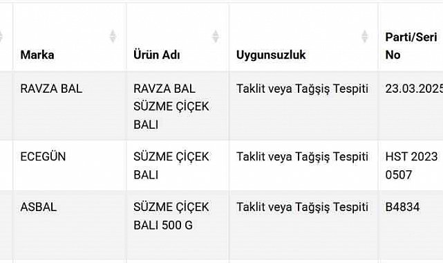 Bakanlığın yayımladığı listeye göre; Gümüşhane'nin Kelkit ilçesinde faaliyet gösteren 'Ravza Bal -Mustafa Keleş' firmasına ait 'Ravza Bal Süzme Çiçek Balı', Ankara'nın Akyurt ilçesindeki 'Vahit Yıldız Balsu -Vahit Yıldız' firmasına ait 'Ecegün Süzme Çiçek Balı', Bursa Nilüfer'deki Asbal Gıda Turizm İnşaat Tekstil Sanayi ve Ticaret Ltd. Şti. firmasına ait 'Asbal Süzme Çiçek Balı 500 G', ürünlerinde taklit veya tağşiş yapıldığı belirlendi.