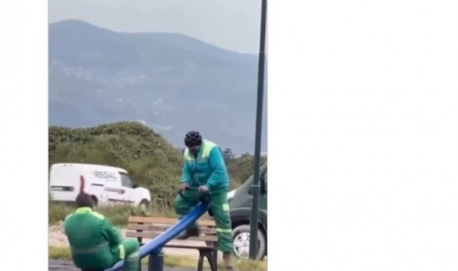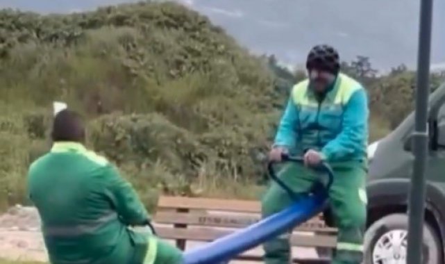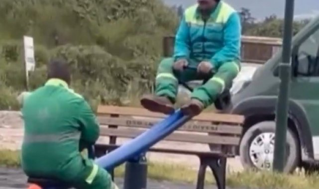 Bursa'da görev yapan belediye temizlik işçilerinin iş arası verdikleri kısa molada tahterevalliye binerek sergiledikleri samimi görüntüler gündem oldu.