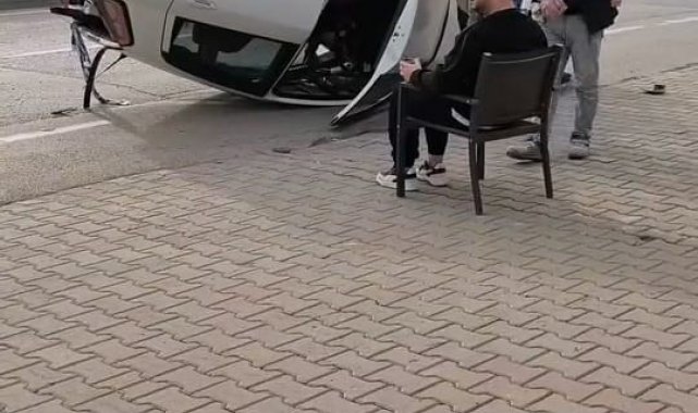 Bursa'nın İnegöl ilçesinde kontrolden çıkan otomobil, refüje çarpıp takla atarak sürüklendi. Kaza anı bir işyerinin güvenlik kamerasına yansıdı.