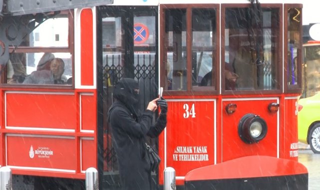 İstanbul Taksim'de kar yağışı etkili olurken vatandaşlar nostaljik tramvayın önünde fotoğraf çekti.