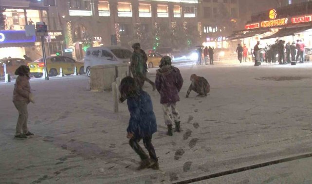 İstanbul Taksim Meydanı'nda gün boyu aralıklarla devam eden kar yağışı gece saatlerinde etkisini gösterdi. Kar yağışının bastırması ile yerli ve yabancı turistler karın keyfini çıkardı.
