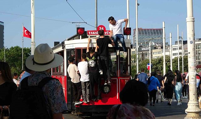 Olay, Beyoğlu Taksim İstiklal Caddesi'nde dün öğle saatlerinde meydana geldi. Taksim ile tünel arasında sefer yapan nostaljik tramvayın üzerinde çıkan ve arkasına tutunan bir grup genç, tehlikeli şekilde yolculuk yaptı. Polis ekipleri gençleri uyararak tramvaydan indirdi. Gençler koşarak kaçtı ardından tramvayın arkasına tekrar bindiler. Gençlerin tramvayın üzerine çıktığı ve dış kısmına tutunarak seyahat ettiği anlar kameraya yansıdı.