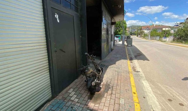 Kocaeli'nin Derince ilçesinde kaynak işlemi sırasında alev alan motosikletten geriye sadece iskeleti kaldı.