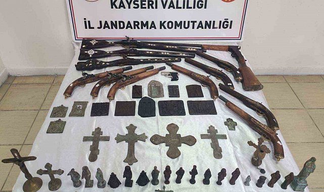 Kayseri İl Jandarma Komutanlığı KOM Şube Müdürlüğü ve Melikgazi İlçe Jandarma Komutanlığı tarafından Anadolu Mirası operasyonları kapsamında yapılan çalışmalarda C.A.T. isimli şahsın iş yeri ve ikametinde ve aracında yapılan aramalarda Etnografik tarihi eserler kapsamında olan 8 adet kısa dipçik tabanca, 4 adet uzun dipçik tüfek ile Roma ve Bizans dönemine ait olduğu değerlendirilen 13 adet bronz tablet, 25 adet bronz heykel, 12 adet bronz obje, 18 adet sikke olmak üzere toplam 80 adet tarihi eser ve 1 adet kuru sıkı tabanca bulundu.