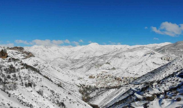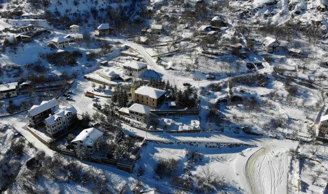 İl merkezine yaklaşık 3 kilometre mesafede bulunan ve çok sayıda tarihi eserin zamana direnerek ayakta kaldığı mahalle, ağaç dallarını kaplayan kar taneleriyle adeta pamuk tarlasını andırdı.