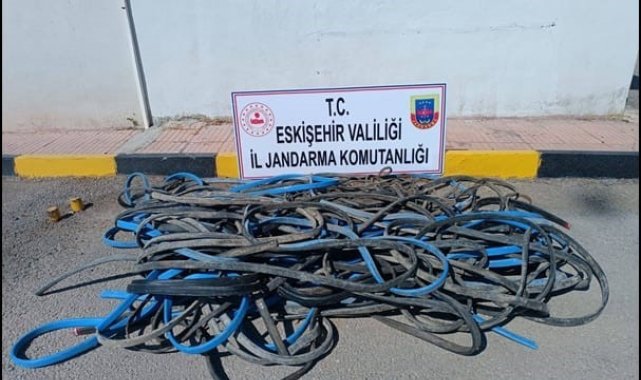 Alpu ilçesinde 28 Ağustos tarihinde meydana gelen tarladan hırsızlık olayının aydınlatılması maksadıyla Eskişehir İl Jandarma Komutanlığı JASAT Dedektif Timleri tarafından çalışma yapıldı. Yapılan çalışmalar neticesinde, olayı gerçekleştiren 2 şüpheli şahıs ile olayda kullandıkları araç tespit edildi. Şüpheli şahıslar Odunpazarı ilçesinde yakalanarak ekiplerce gözaltına alınırken, araçta yapılan aramada 300 metre elektrik kablosu ile 1 adet kablo kesme makası ele geçirildi. Şüpheli şahısların Alpu, Tepebaşı ve Mahmudiye ilçelerinde de 33 elektrik panosundan, piyasa değeri yaklaşık 600 bin TL olan 800 metre elektrik kablosu çaldıkları tespit edildi. Ayrıca şahısların kabloları il merkezinde 2 ayrı hurdacıya sattıkları belirlendi. Haklarında soruşturma başlatılan 2 şüpheli şahıs, çıkarıldıkları mahkemece tutuklanarak Eskişehir L Tipi Kapalı Ceza İnfaz Kurumuna teslim edildi.