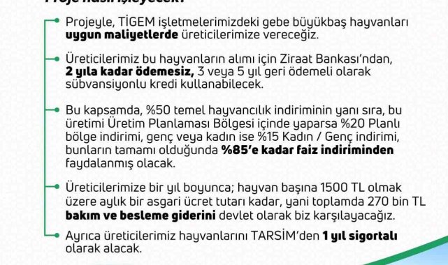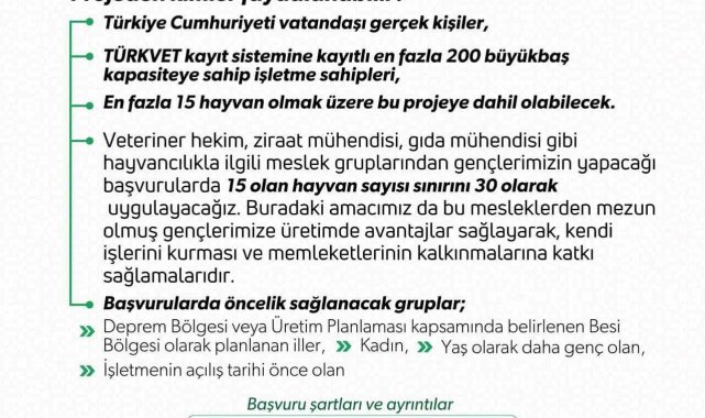 Yapılan açıklamada Hayvancılığa Destek Projesinin detayları hakkında bilgi verilirken destekten yararlanma şartlarının neler olduğu aktarıldı. Yapılan açıklamaya göre; Hayvancılığa Destek Projesine, TÜRKVET kayıt sistemine kayıtlı en fazla 200 büyükbaş kapasiteye sahip işletme sahipler en fazla 15 hayvan olmak üzere bu projeye dahil olabilecek. Veteriner hekim, ziraat mühendisi, gıda mühendisi gibi hayvancılıkla ilgili meslek gruplarından gençlerin yapacağı başvurularda ise 15 olan hayvan sayısının sınırını 30 olarak uygulanacak. Destek projesindeki amacın veteriner hekimliği, ziraat ve gıda mühendisliği bölümlerinden mezun olmuş gençlerin üretimde avantajlar sağlayarak, kendi işletmelerini kurması ve memleketlerinin kalkınmalarına katkı sağlamaları olduğunun ifade edildiği bilgilendirmede başvurularda öncelik sağlanacak gruplar da açıklandı. Deprem bölgesi veya üretim planlaması kapsamında belirlenen besi bölgesi olarak planlanan iller; kadınlar, yaş olarak daha genç olanlar ve işletmenin açılış tarihi önce olanlar öncelikli grup arasında yer alıyor. Projeyle, TIGEM işletmelerindeki gebe büyükbaş hayvanlar uygun maliyetlerde üreticilere verilecek.