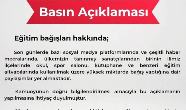 Sivas İl Milli Eğitim Müdürlüğü tarafından yapılan yazılı açıklamada, "Son günlerde bazı sosyal medya platformlarında ve çeşitli haber mecralarında ülkemizde tanınmış sanatçılarından birinin ilimiz içerisinde; okul, spor salonu, kütüphane alt yapılarında kullanılmak üzere bağış yaptığına dair paylaşımlar yer almaktadır. Kamuoyunun doğru bilgilendirmesi amacıyla bu açıklamanın yapılmasına ihtiyaç duyulmuştur. Söz konusu paylaşımlar ve iddialar gerçeği yansıtmamaktadır. İddialara konu edilen bağışlarla ilgili olarak resmi kurumlarımıza yapılmış herhangi bir müracaat bulunmamaktadır." denildi.