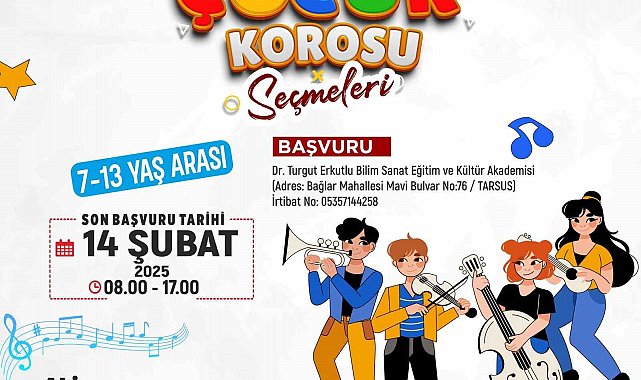 Tarsus Belediyesi, çocukları müzikle buluşturmak ve yeteneklerini keşfetmelerine imkan sağlamak amacıyla 'Çocuk Korosu' seçmeleri düzenliyor. 7-13 yaş arası çocukların katılabileceği koro, müziğe ilgisi olan minik yeteneklere hem kendilerini geliştirme hem de keyifli bir deneyim yaşama fırsatı sunacak.