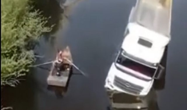 Taşkın sularında yan mahsur kalan tır sürücüsünü itfaiye ekipleri kurtardı