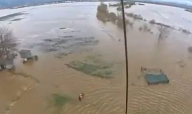 Aydın'ın Koçarlı ilçesinde Menderes Nehri'nin taşması sonucu birçok arazi sular altında kalırken, suların ortasında mahsur kalan vatandaşın helikopter ile kurtarılma anı jandarma kamerasına anbean yansıdı.