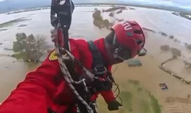 Aydın genelinde etkili olan sağanak yağış sebebiyle Büyük Menderes Nehri'nde yer yer taşkınlar meydana geldi. Koçarlı ilçesinden de geçen nehrin taşması sonucu ovadaki birçok arazi ve hayvan damları sular altında kaldı. Su seviyesinin yükselmesi ile birlikte bölgede tahliye çalışmaları gerçekleştirilirken, Kasaplar Mahallesi'nde hayvanlarını korumak amacıyla damda bekleyen Abdullah Öpöz, yaşanan taşkın üzerine suların ortasında mahsur kaldı. Kara bağlantısının kesildiği bölgede Öpöz'ün kurtarılması için çalışma başlatıldı. Olay yerine yönlendirilen Aydın Jandarma Filo Komutanlığı'na ait helikopterle bulunduğu noktadan alınan Öpöz, sağlık kontrolü için hastaneye sevk edildi. Vatandaşın sağlık durumunun iyi olduğu öğrenilirken, kurtarma operasyonuna ait jandarma kamerası görüntüleri ortaya çıktı. Helikopter kamerasına anbean yansıyan görüntülerde, Öpöz'ün mahsur kaldığı yerden kurtarılması ve güvenli bir şekilde helikoptere alınması yer aldı.