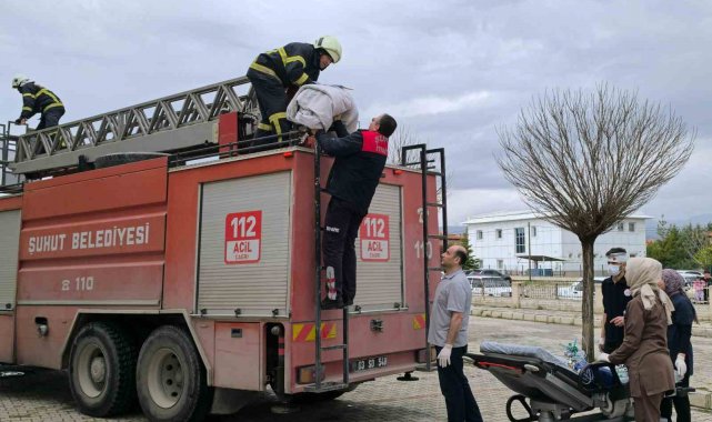 Şuhut Devlet Hastanesi'nde 'Hastane Afet ve Acil Durum Planı (HAP)' doğrultusunda 2025 yılı deprem ve yangın tatbikatı gerçekleştirildi. Şuhut Devlet Hastanesi Başhekimliği tarafından düzenlenen yangın tatbikatı, 112 Acil sağlık, itfaiye, ilçe emniyet müdürlüğü ve hastane çalışanlarının katılımıyla gerçekleştirildi. Hastanenin acil servisinde "Yangın var" uyarısıyla başlayan tatbikatta senaryo gereği, hastane önüne yönlendirilen ekiplerince güvenlik koridoru oluşturarak yaralanan, dumandan etkilenen ve bina içinde mahsur kalan hastalar kurtarıldı. Giriş kattaki yaralılar sedyeyle hastane dışına çıkartılırken, üst katlarda mahsur kalan yaralılar ise merdivenli itfaiye aracıyla indirildi.