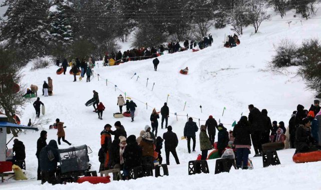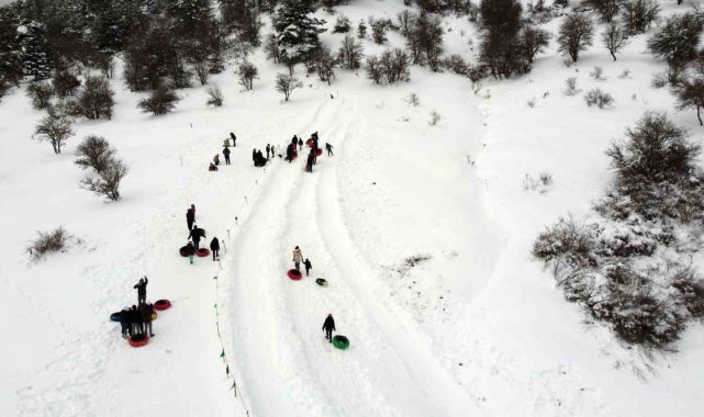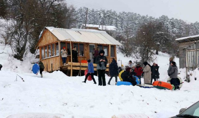 Bolu'nun Mudurnu ilçesine bağlı Örencik Yaylası'nda köylüler tarafından oluşturulan kayak pistinde, Abant Gölü Milli Parkı'na gelen vatandaşlar kızak, şambrel ve poşetlerle kayarak eğlendi.