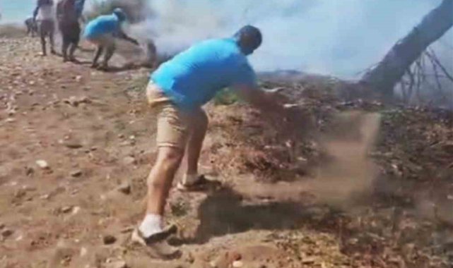 Fethiye'nin günübirlik tatil koylarından Karaot Aymaz sahilinde iki gün önce sahile yakın bölgede orman yangını çıktı. Yangına ilk müdahale sahilde bulunan tatilciler elleri ile toprakları alevlerin üzerine atması ile başladı.
