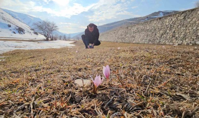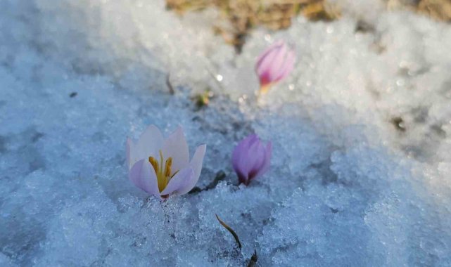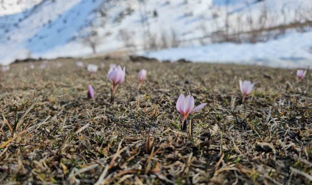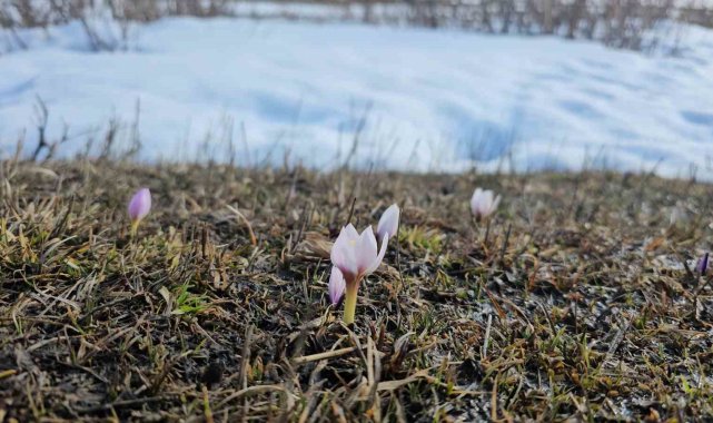 Bitlis'in Tatvan ilçesinde baharın habercisi olarak bilinen çiğdem çiçekleri, karların arasından yüzünü göstermeye başladı.