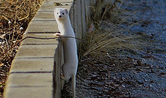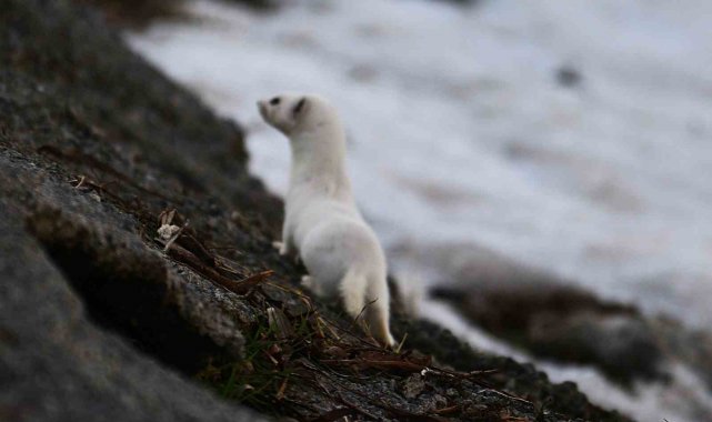 Bitlis'in Tatvan ilçesinde nadir görülen hayvan türlerinden biri olan beyaz gelincik, Van Gölü sahilinde görüntülendi.