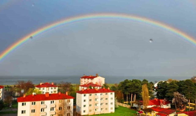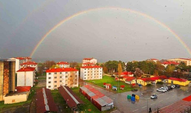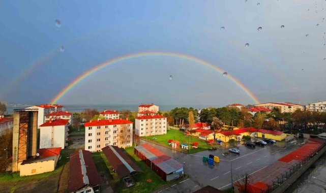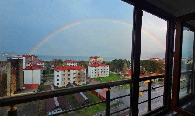 Çift gökkuşağının da zaman zaman belirdiği manzara, sosyal medyada da kısa sürede ilgi gördü.