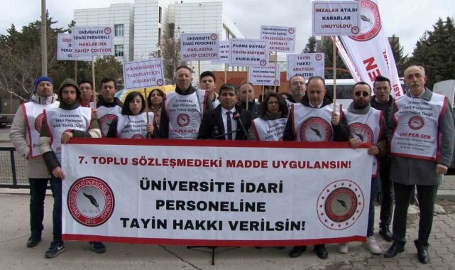 ÜNİPERSEN, üniversitelerde idari kadrolarda çalışan memurların başta tayin hakkı olmak üzere diğer memur haklarından da yararlanabilmesi talebiyle YÖK önünde eylem düzenledi. YÖK binası önünde pankart açıp slogan atan sendika üyeleri taleplerini dile getirdi. ÜNİPERSEN Genel Başkanı İbrahim Güzel yaptığı basın açıklamasında, "Bizler, üniversitelerde 657 sayılı Devlet Memurları Kanunu'na tabi çalışan devlet memurlarıyız. Devlet memurlarının en doğal hakkı olan tayin hakkı için buradayız. Bugün tüm üniversite önlerinde ve burada YÖK önünde bir kez daha ses yükselterek, hem devlet memuru olmanın getirdiği hakları hem de üniversite personeli olmanın getirdiği hakları almak için toplandık. Bilindiği üzere 7. dönem toplu sözleşmede üniversite idari personelinin tayin sorununun çözümü için çalışma yapılması kararı alınmıştı. Yükseköğretim Kurulu da konuya ilişkin 2024 yılı Şubat ayında üniversitelerden talep toplayarak, hazırlık çalışmasına başlandığını bildirmişti. Aradan geçen 1 yıllık sürede 'Taslak çalışmayı yaptık, Cumhurbaşkanlığına gönderdik' demenin ötesine gidilmedi" şeklinde konuştu.