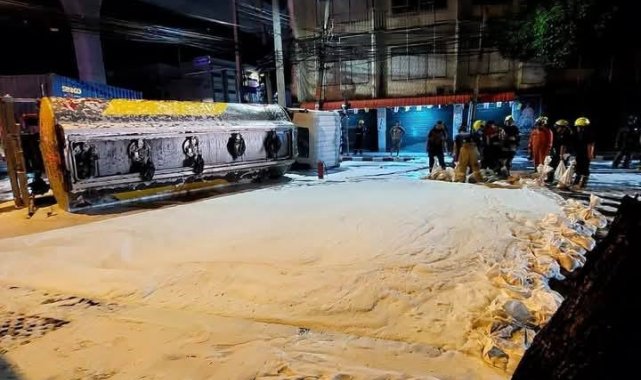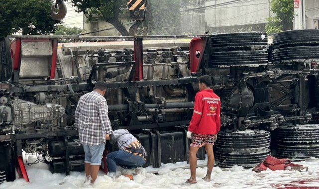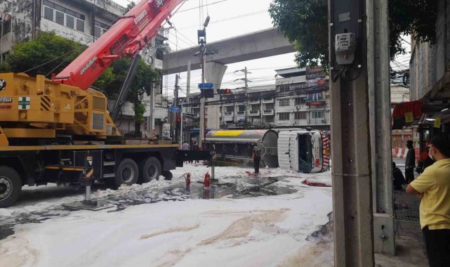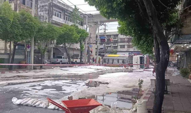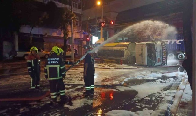 Tayland'da akaryakıt tankerinin karıştığı kazada faciadan dönüldü. Başkent Bangkok'un Rat Burana ilçesinde, çok sayıda ev ve işyerinin bulunduğu bir sokakta yerel saatle 00.02'de konteyner yüklü bir tır ile akaryakıt tankerinin çarpıştı. Kazada, 16 bin litre akaryakıt taşıdığı tespit edilen tanker yan devrilirken, 600 litre benzin yola döküldü.