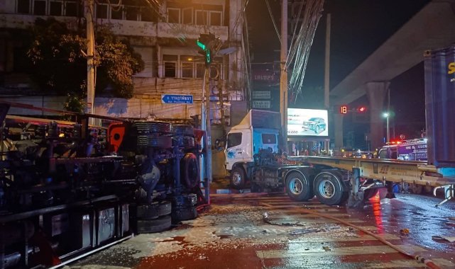 Tayland'ın başkenti Bangkok'ta dün gece saatlerinde konteyner yüklü bir tır ile akaryakıt tankerinin çarpışması sonucu meydana gelen kazada, yaklaşık 600 litre benzin yola döküldü.