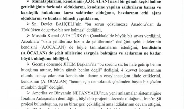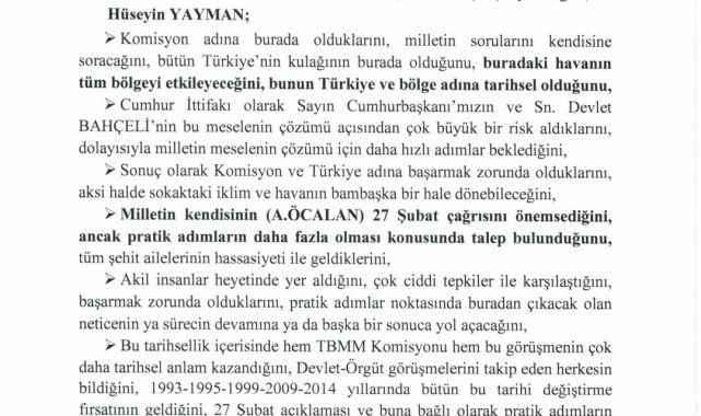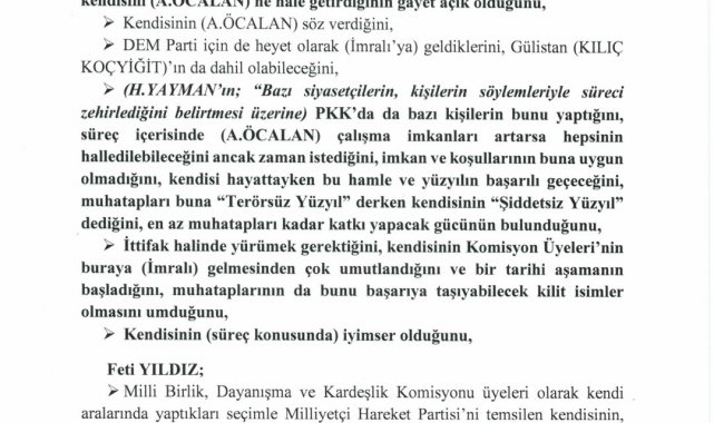 Terörist başı Abdullah Öcalan ile Milli Dayanışma, Kardeşlik ve Demokrasi Komisyonu çalışmaları kapsamında görüşmeye giden AK Parti Genel Başkan Yardımcısı Hüseyin Yayman, MHP Genel Başkan Yardımcısı Feti Yıldız ve DEM Parti Grup Başkanvekili Gülüstan Kılıç Koçyiğit ziyaret tutanakları TBMM sitesinden yayımlandı.