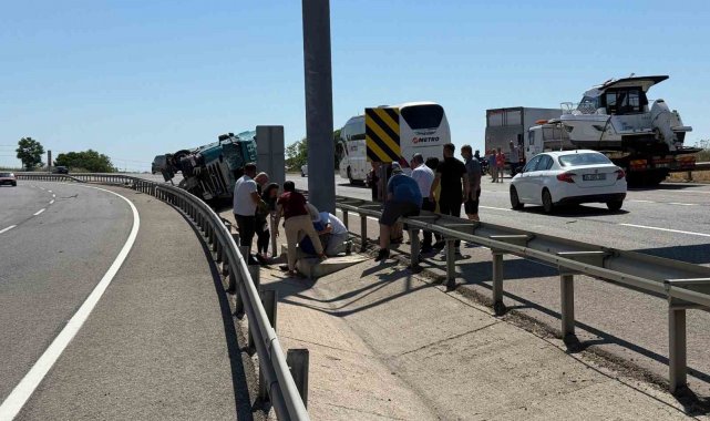 Edinilen bilgiye göre, M.A. yönetimindeki 34 SM 3173 plakalı tır, seyir halindeyken sürücüsünün kontrolü kaybetmesi sonucu devrildi. Kazanın etkisiyle sürücü camdan orta refüje savruldu. İhbar üzerine olay yerine polis ve sağlık ekipleri yönlendirildi. İlk müdahalesi olay yerinde yapılan sürücü, ambulansla Tekirdağ İsmail Fehmi Cumalıoğlu Şehir Hastanesi'ne kaldırıldı. Kaza sebebiyle yolda trafik bir süre kontrollü olarak sağlandı. Devrilen tırın kaldırılması için ekiplerce çalışma başlatıldı.