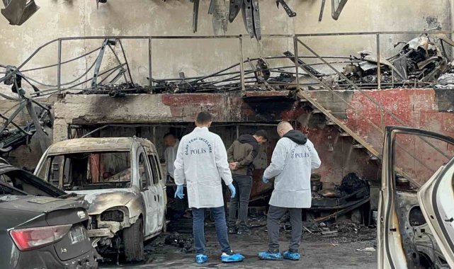 Yangın sonrası işyeri tamamen kullanılamaz hale gelirken, onarıma getirilen içerideki milyonlarca liralık 6 otomobil de hurda yığınına döndü.