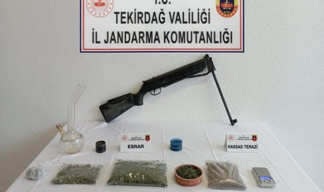 Marmaraereğlisi ilçesi Yeniçiftlik Mahallesi'nde H.S. isimli şüphelinin evinde ve üzerinde yapılan aramalarda 485 gram kubar esrar, 20 gram toz esrar, 360 gram kenevir tohumu, 1 adet hassas terazi, 2 adet kenevir öğütme aparatı, 1 adet bong ve 1 adet faturasız havalı tüfek ele geçirildi.