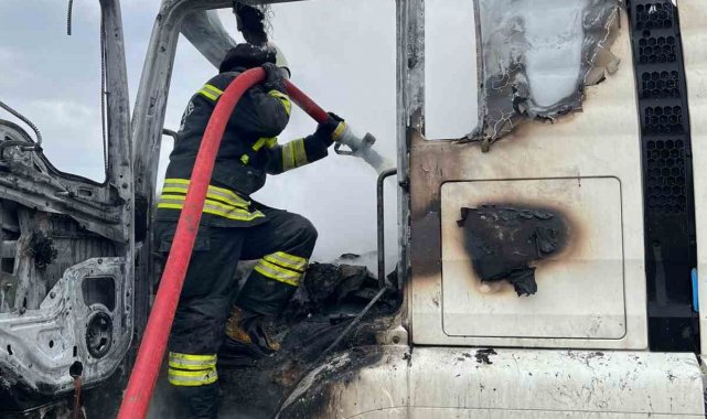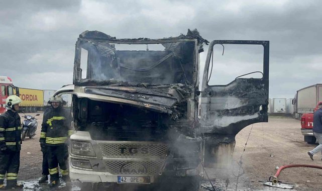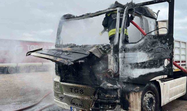 Yangın sonrası tır kabini hurda yığınına döndü. Yangının sigorta kutusundan çıkmış olabileceği öne sürüldü.