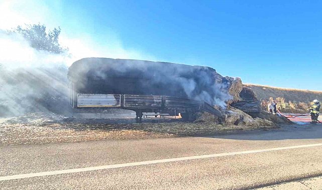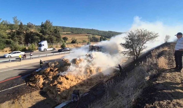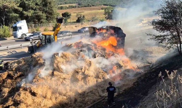 Tekirdağ'da LPG'li bir araçta çıkan yangın, buğday tarlasına ve ardından seyir halindeki tırın dorsesindeki saman balyalarına sıçradı. Yangında yaklaşık 200 dönümlük alan kül olurken, jandarma ve polis ekipleri yolu trafiğe kapattı.