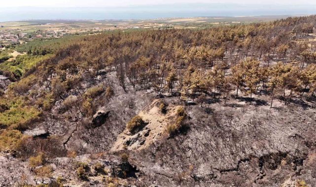Tekirdağ'ın Şarköy ilçesindeki orman yangını kontrol altına alınırken, yanan alanlar dronla havadan görüntülendi.