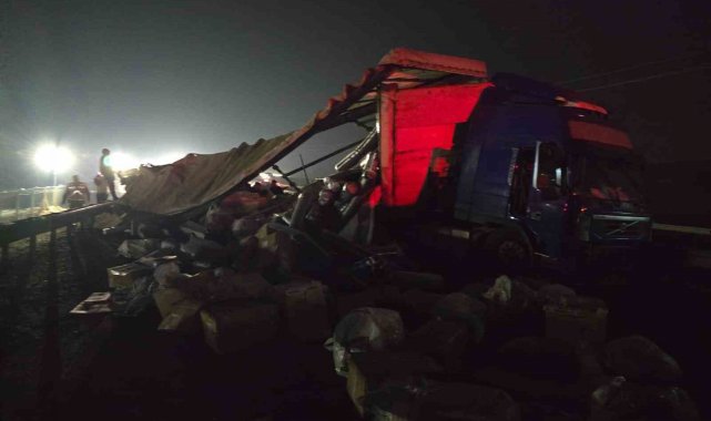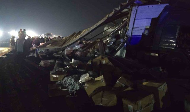 Tekstil malzemesi yüklü tır devrildi: Yol trafiğe kapandı