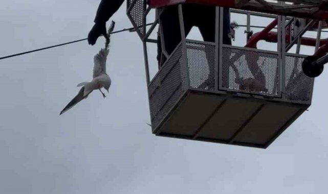 Zonguldak Limanı girişinde tel örgülere kanadı takılan ve asılı kalan martı, itfaiye ekiplerinin titiz çalışmasıyla kurtarıldı. Vatandaşların dikkati sayesinde hayata tutunan martı, ekiplerce yeniden gökyüzüne salındı.