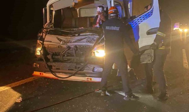 Bolu TEM Otoyolu'nda kamyon ile çarpışan kamyonet sürücüsü, araç kabininde sıkışarak yaralandı.
