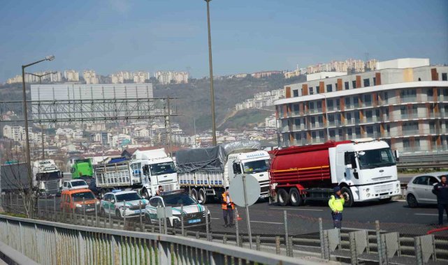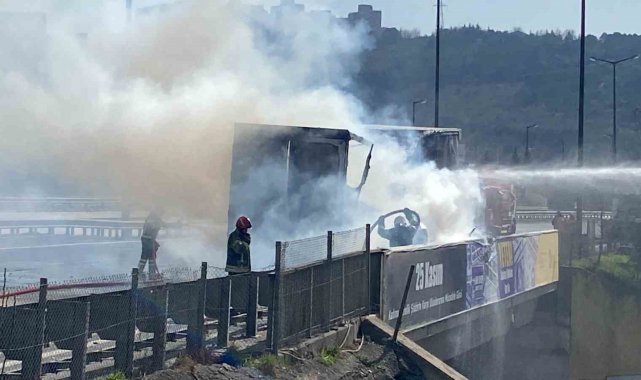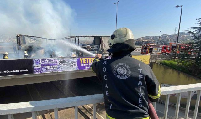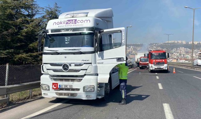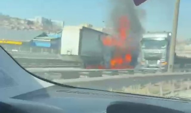 TEM Otoyolu'nun Kocaeli geçişinde lastiği patlayan kağıt rulo yüklü tırda yangın çıktı. Tır alevlere teslim olurken, TEM'in Ankara istikametinde kilometrelerce araç kuyruğu oluştu.