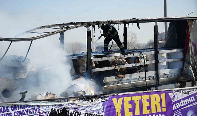 Olay, TEM Otoyolu'nun Ankara istikameti Yenişehir Mahallesi mevkisinde meydana geldi. Edinilen bilgiye göre, Gebze'den yüklediği kağıt ruloları Konya'ya götüren M.Ç. idaresindeki 42 EMC 92 Mercedes marka tırın lastiği patladı. Tırı sağa çeken sürücü, araçtan indiği esnada lastikte yanma meydana geldi. Sürücü yangın tüpüyle alevlere müdahale etmeye çalışsa da başarılı olamadı. Yangının dorseye sıçramasıyla sürücü M.Ç., çekiciyi dorseden ayırarak 112 Acil Çağrı Merkezi'ne ihbarda bulundu. İhbar üzerine olay yerine itfaiye, polis ve jandarma ekipleri sevk edildi. Kısa sürede olay yerine gelen itfaiye ekipleri, yangını söndürmek için çalışma başlattı. Ekiplerin uzun uğraşları neticesinde yangın söndürülürken, dorse kısmı tamamen yanarak geriye demir yığını kaldı.
