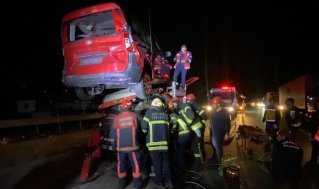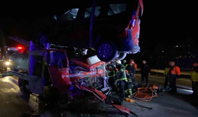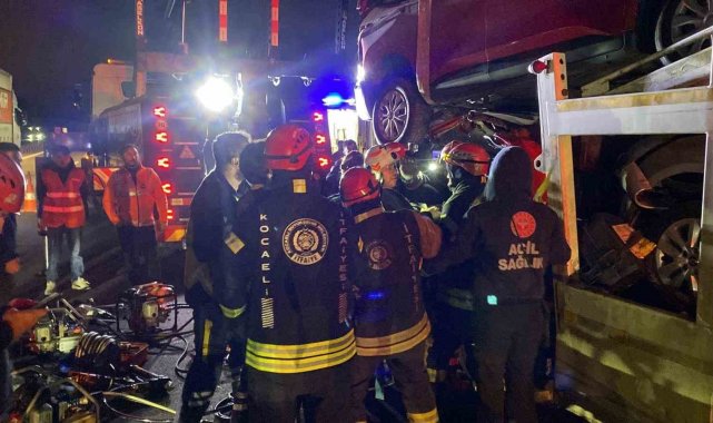 TEM Otoyolu'nun Kocaeli geçişinde tıra arkadan çarpan kamyonetin sürücüsü, hem çarptığı tır hem de kendi taşıdığı aracın kabine kayması sonucu iki taraftan mahsur kaldı. İtfaiye ekiplerinin, üstten sarkan aracın düşmemesi için vinçle sabitleyerek gerçekleştirdiği titiz çalışmada, yaralı sürücü uzun uğraşlar sonucu sıkıştığı yerden kurtarıldı.